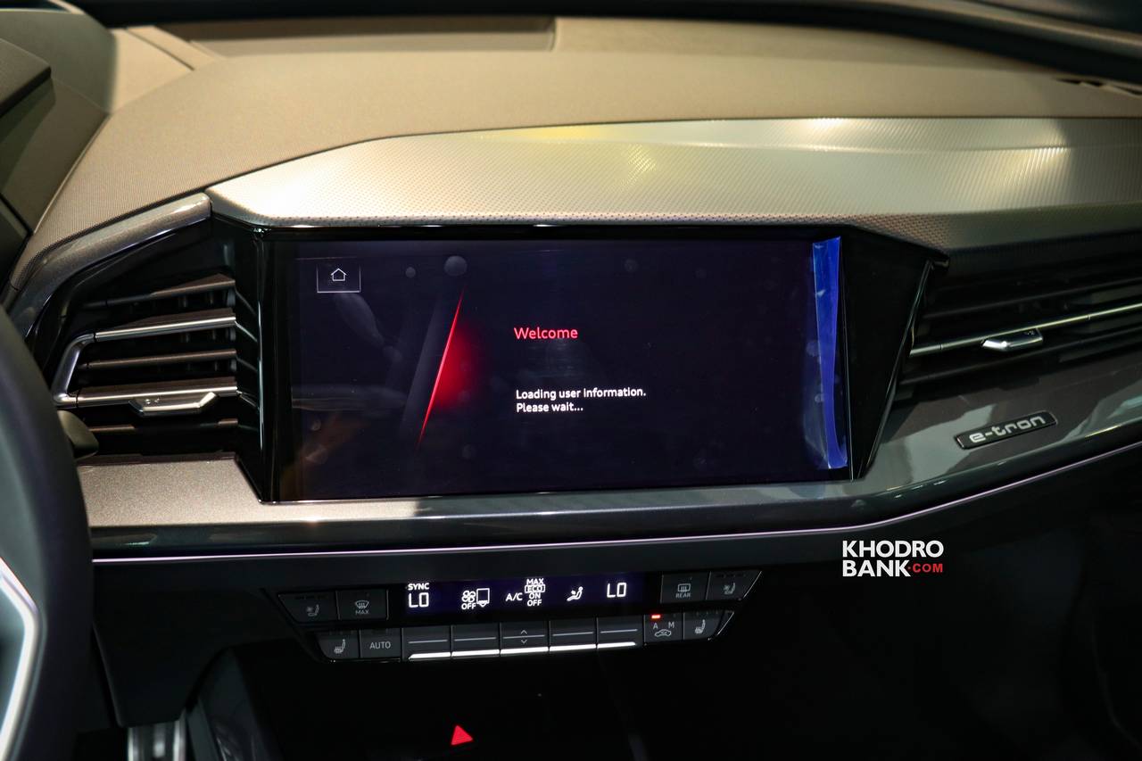با ورود به کابین آئودی Q5 e-Tron با فضایی بسیار مدرن و جذاب رو به رو میشویم که برخلاف برخی از خودروهای چینی، از متریال بسیار با کیفیت در آن استفاده شده است. نکته قابل توجهی که در همین ابتدا توجه را به خود جلب میکند، شباهت بسیار زیاد کابین به مدل Q4 e-Tron است که تنها در برخی از جزئیات با یکدیگر تفاوت دارند. به طور مثال غربیلک فرمان چند ضلعی که در نوع خود بسیار خاص و متمایز است، دکابین این خودرو هم مشاهده میشود. از طرفی فرم خاص طراحی داشبورد و کنسول میانی به گونهای است که نمایشگر مرکزی با زاویهای نسبتا زیاد به سمت راننده متمایل شده است. همچنین دریچههای ورودی هوا به کابین به صورت یکپارچه و چند ضلعی طراحی شدهاند که نمایی مدرن و متفاوت را پیش روی سرنشینان قرار میدهد. کنسول میانی هم به صورت برجسته و جدا از داشبورد طراحی شده و تعداد محدودی کلید فیزیکی را بر روی خود جای داده است. این کلیدهای کنترلی صرفا در بخش پایین نمایشگر مرکزی، برای تنظیم سیستم تهویه مطبوع و سایر تجهیزات گرمایشی و سرمایش تعبیه شدهاند.