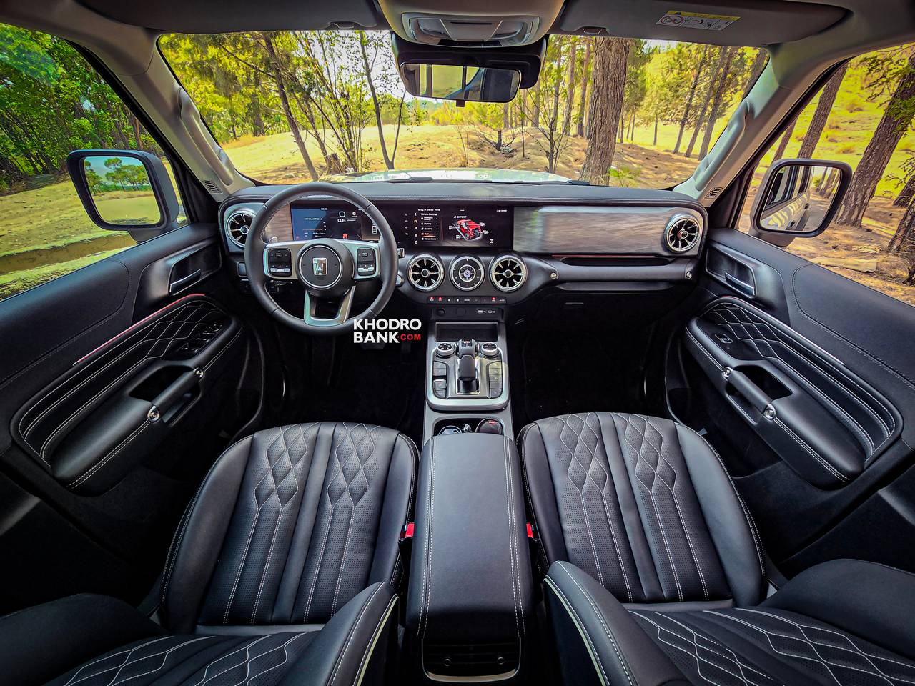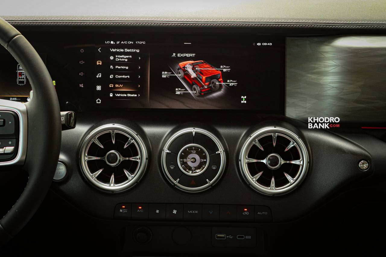 اما داخل کابین کاملا فضایی متفاوت را شاهد هستیم که با تبعیت کردن از الگوهای طراحی مرسدس بنز خصوصا شاسیبلند جی کلاس، نمایی بسیار جذاب و مدرن را پدید آورده است. در این بخش کلاستیر دیجیتال که از دو نمایشگر متصل به هم تشکیل شده است، در همان ابتدا توجه را به خود جلب میکند. همچنین دریچههای ورودی هوا به درون کابین نیز کاملا مشابه با محصولات مرسدس بنز است که میتواند برای عدهای از علاقهمندان خوشایند باشد. انتخابگر دایرهای حالات رانندگی و دریچههای دایرهای به همراه صفحه آمپر دیجیتالی که تا میانه داشبورد کشیده شده است، همگی از ویژگیهای جالبی هستند که داحل کابین توجه را به خود جلب میکنند. به طور کلی طراحی داشبورد و تریم داخلی با استفاده از متریال با کیفیت از دیگر ویژگیهای شاخص در داحل کابین تانک 300 است. گفتنی است در برخی از تصاویر تریم داخلی این خودرو به صورت دو رنگ است که باید منتظر ماند و دید که شتابان خودرو پرشیا قصد دارد این خودرو را با چه تریمی وارد بازار ایران کند.