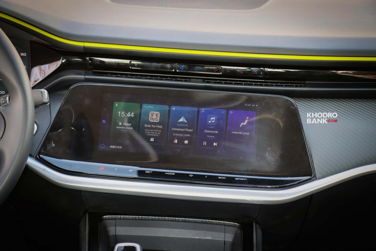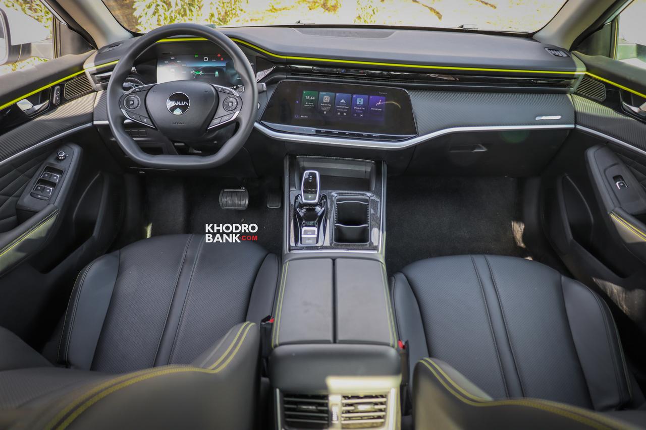 با نگاه نخست به کابین شاین مکس هیبریدی میتوان متوجه شد که طراحی فضای داخل کابین آن شباهت زیادی با نسخه بنزینی دارد. طراحان دانگفنگ سعی گردهاند از الگوهای ترند روز در طراحی کابین این خودرو استفاده کنند و ظاهری مدرن به آن ببخشند، که باید گفت در این زمینه توانستهاند ماموریت خود را به درستی انجام دهند. غربیلک فرمان D کات در این خودرو یکی از مواردی است که همان ابتدا نگاه را به سمت خود میکشاند. چرا که نشان آئولوس در مرکز آن خودنمایی میکند و نوع چیدمان کنترلرهای آن کمی متفاوتتر از سایر خودروهاست. همچنین رنگ فسفری که پیشتر در بخشهای از نمای ظاهری خودرو مشاهده کرده بودیم نیز در تیریم داخلی این خودرو به چشم میخورد که این موضوع نشان میدهد طراحان دانگفنگ سعی کردهاند این رنگ را به نشانی از طراحی شاین مکس هیبریدی تبدیل کنند. گفتنی است تریم چرمی مشکی در کنار دیزاین فیبرکربنی و رنگ فسفری، نمایی جذاب و متفاوت را ایجاد کرده است.