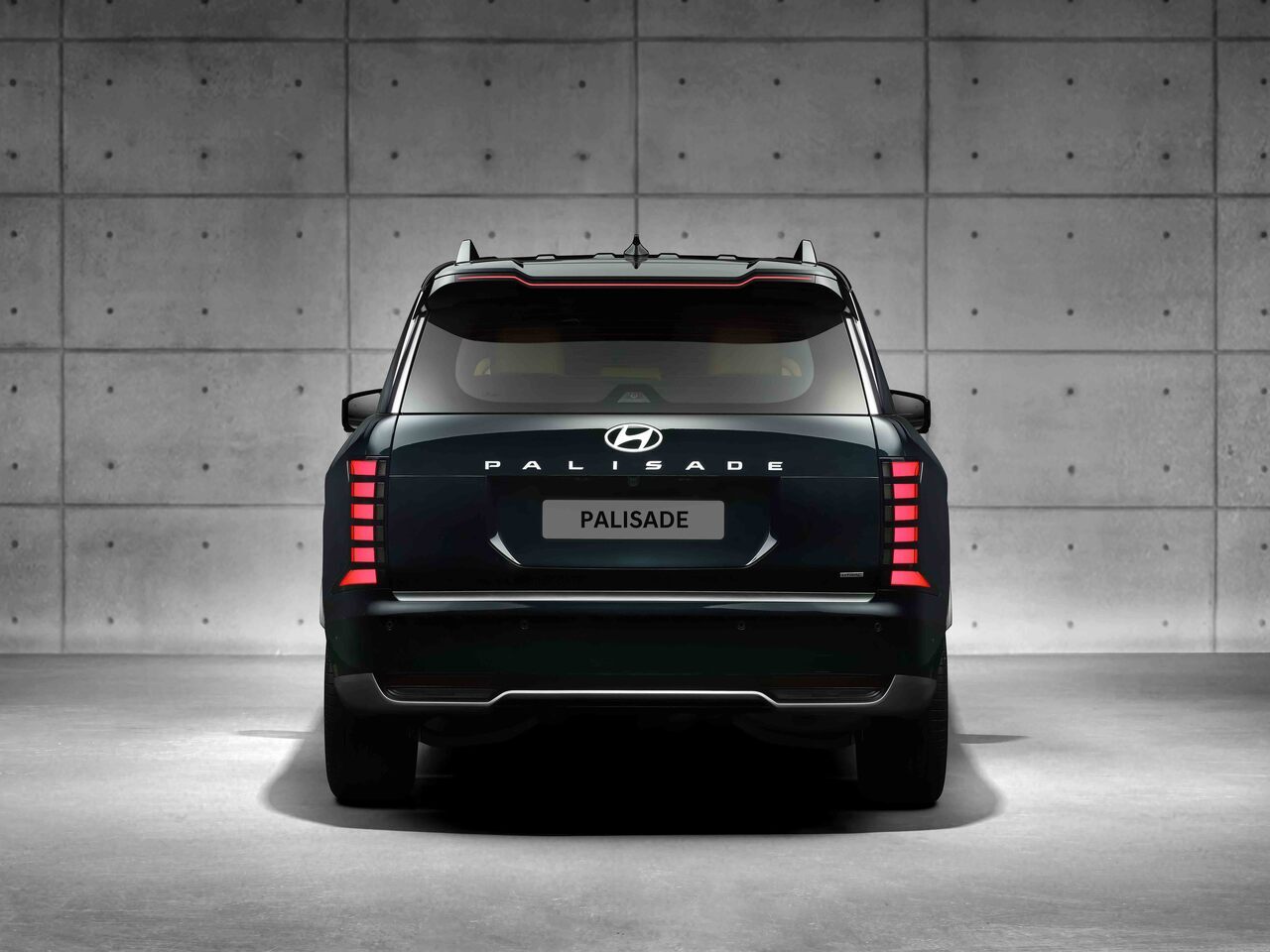 نمای جلو هیوندای پالیسید 2026 در نمای جانبی، تناسبات کلی خودرو همچنان حفظ شده اما طراحی بدنه سادهتر است. خط شانه کشیده، گلگیرهای برجسته و استفاده از رینگهای بزرگ 21 اینچی، ظاهر خودرو را عضلانیتر نشان میدهد. همچنین طراحی ستونها و شیشهها به گونهای انجام شده که پالیسید همچنان حس یک شاسیبلند جادار و کاربردی را حفظ کند، اما در عین حال ظاهری سطح بالاتر و لوکستر داشته باشد. در بخش عقب نیز چراغها با گرافیک جدید و طراحی عمودی، هماهنگی بیشتری با نمای جلو پیدا کردهاند و نمای کلی خودرو را مدرنتر کردهاند.