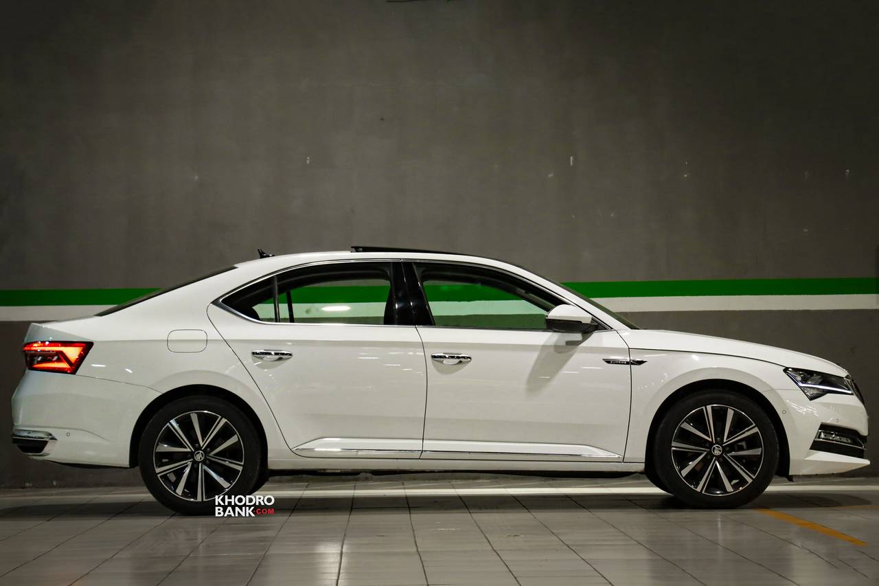 اشکودا سوپرب در نمای جانبی خبری از طرح های پیچیده و فانتزی امروزی نیست و پروفیل های بدنه با سادگی هرچه تمام، به نمایش در آمده اند. خط شانه که از گلگیر جلو تا انتهای خودرو امتداد یافته، تصویری از فولکس واگن پاسات را در ذهن مخاطب تداعی می کند. همچنین فاصله بین دو محور 2841 میلی متری نیز در این نما به خوبی قابل مشاهده است. در نمای عقب نیز می توان ظرافت و سادگی را شاهد بود. به گونه ای که یک زه کرومی چراغ های عقب را به یکدیگر متصل کرده و خبری از چراغ های به هم پیوسته نیست. همچنین در این بخش خبری از ادوات پلاستیکی مشکی رنگ حجیم نیست و تنها یک دیفیوزر باریک در زیر سپر، چهره ای اسپرت تر به این سدان اروپایی بخشیده است.