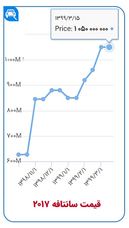 نمودار قیمتی هیوندای سانتافه 2017 را در تصویر زیر میبینید. آخرین قیمت این خودرو در 15 خرداد بیش از یک میلیارد تومان بوده است که عدد بزرگی است. اگر در هنگام خرید این خودرو دقت کافی نداشته باشید و خودروی کارشناسی شده نخرید، ممکن است تا 100 میلیون تومان ضرر کنید!