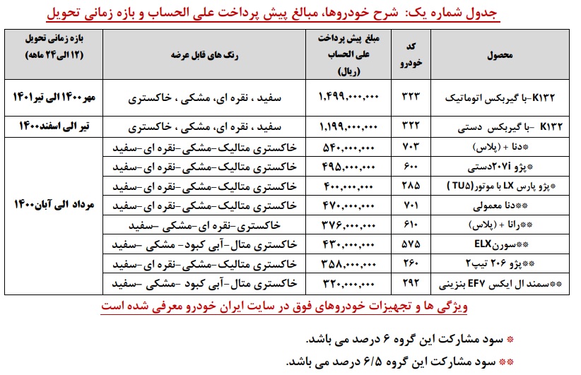 سود مشارکتمتقاضیان خرید محصول جدید ایران خودرو K132 همانند مشتریان دیگر خودروهای این شرکت، از طریق قرعه کشی مشخص خواهند شد و پیش پرداخت تعیین شده را به حساب شرکت واریز خواهند نمود. مبلغ در نظر گرفته شده برای پیش پرداخت خودرو K132 دندهای برابر با 119 میلیون و 900 هزار تومان و مبلغ اعلام شده برای پیش پرداخت K132 اتوماتیک نیز 149 میلیون و 900 هزارتومان اعلام شده است. مطابق اعلام ایران خودرو، طی حداکثر سه روز کاری پس از پایان موعد ثبت نام در شرایط فروش ایران خودرو، عملیات ثبت نام انجام خواهد پذیرفت.