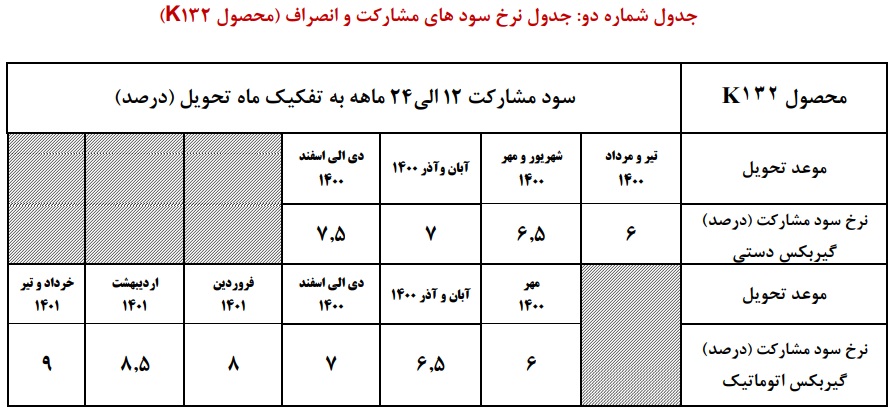 شرایط فروش ایران خودروبرخلاف هشت خودرو دیگر، برای شرایط پیش فروش K132 سود مشارکتی متفاوت با دیگر خودروها در نظر گرفته شده است. نرخ سود مشارکت شرایط پیش فروش K132 با طولانی شدن موعد تحویل افزایش مییابد که در جدول زیر میتوانید این نرخها را مشاهده کنید. مطابق اعلام ایران خودرو، سود انصراف نیز سه درصد کمتر از سود مشارکت در نظر گرفته خواهد شد.