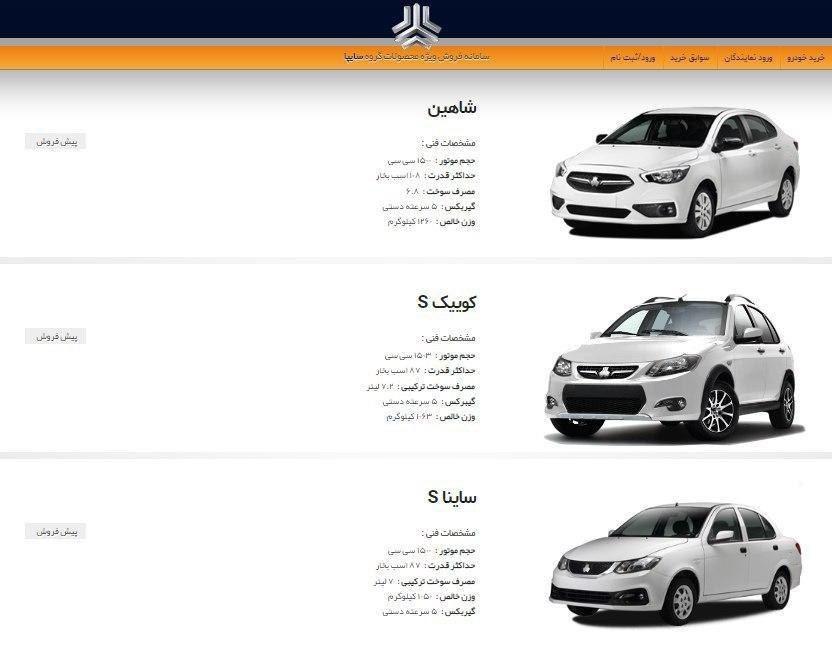 در طرح پیش فروش گروه خودروسازی سایپا، امکان ثبت نام محصولاتی همچون خودروی جدید "شاهین"، "کوییک S" و "ساینا S" فراهم شده است که به ترتیب برای خودروی شاهین پیش پرداخت 80 میلیون تومانی، برای خودروی سایپا کوییک S پیش پرداخت 40 میلیون و 800 هزار تومانی و همچنین برای خودروی "ساینا S" پیش پرداخت 39 میلیون و 800 هزار تومانی تعیین شده است.