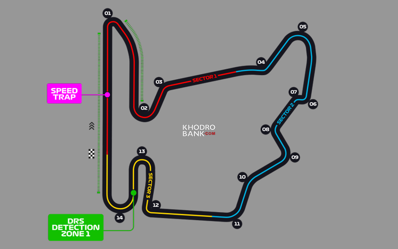 تمام نشانههایی که روی آسفالت کشیده شدهاند با استفاده از رنگهای غیرلغزنده بوده است. گاردریلهای دور پیچ 1، شیکین و پیچ 9 جابجا شدهاند. این پیست یک نقطه تشخیص DRS و دو محدوده DRS دارد. تنها نقطه تشخیص آن چند متر قبل از پیچ 14 میباشد و محدوده اول 40 متر بعد از پیچ 14 و محدوده دوم 6 متر بعد از پیچ قرار دارند.