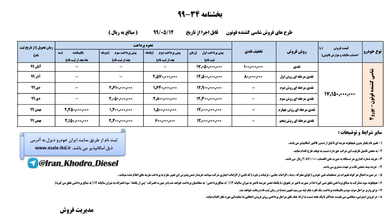 در اطلاعیه فروش جدید ایران خودرو دیزل، کشنده فوتون یورو 4 با قیمت قطعی 1 میلیارد و 715 میلیون تومانی ثبت سفارش می شود و مشتریان می توانند به صورت نقدی و یا نقدی چند مرحله ای نسبت به نام نویسی آن اقدام کنند. بسته به انتخاب شرایط فروش، موعد تحویل این کامیون از آبان ماه تا بهمن ماه سال جاری تعیین شده است که جزییات بیشتر آن را می توانید در جدول زیر شاهد باشید.