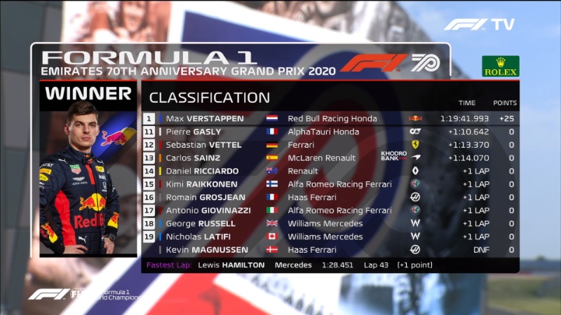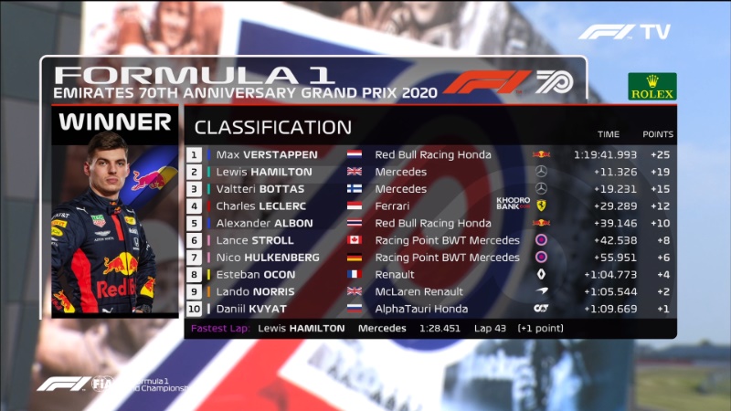 پیروزی مکس ورشتپن در سالگرد ۷۰ سالگی فرمول یک در حالی رقم خورد که مکس مسابقه را از رده چهارم و پشت سر نیکو هالکنبرگ شروع کرده بود. مکس با یک استارت عالی توانست در همان ابتدای مسابقه نیکو را پشت سر بگذارد و فاصله خود را با خودروهای مرسدس کاهش دهد. در ادامه مکس توانست با استراتژی بهتر نسبت به تیم مرسدس، پیروز مسابقه شود و یک برد شیرین را برای تیم ردبول رقم بزند.