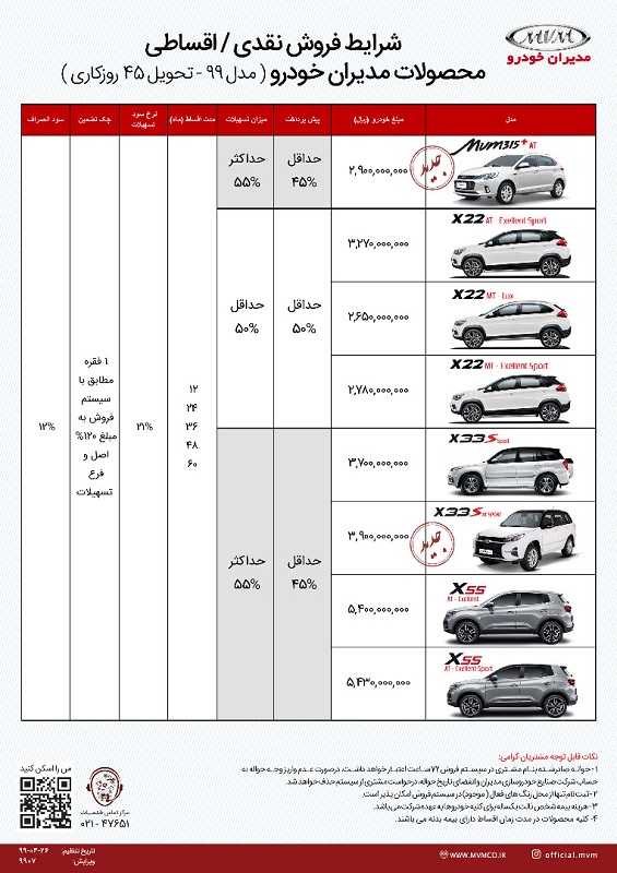 تمامی خودروهای حاضر در شرایط فروش ام وی ام با موعد 45 روز کاری قابل تحویل هستند و تمامی خودروها در مدل 99 تحویل مشتری میشوند. نرخ سود تسهیلات در نظر گرفته شده برای این شرایط 21 درصد و نرخ سود انصراف نیز 12 درصد اعلام شده است.