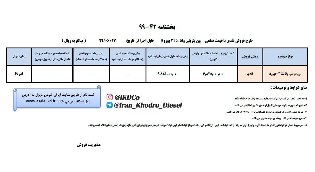 در این شرایط فروش، ایران خودرو قیمت قطعی 682 میلیون و 500 هزار تومانی را برای فروش خودروی "ون وانا 3TZ بنزینی یورو 5" تعیین کرده است که نسبت به قیمت اعلام شده در تیرماه امسال، افزایش قیمت شدید بیشتر از 130 میلیون تومانی را تجربه کرده است.
