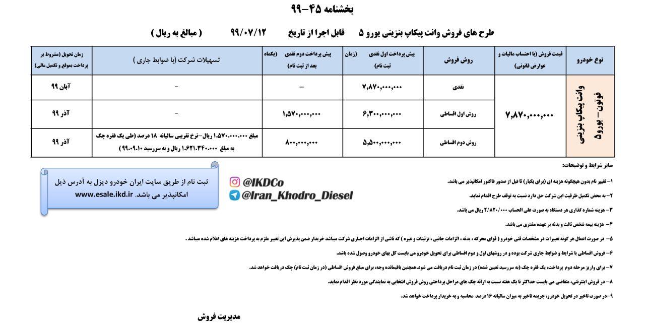 علاوه بر این برای نسخه دیزلی هم قیمت مصوب 837 میلیون تومانی در نظر گرفته شده که جهش قیمت این مدل نسبت به نسخه بنزینی بیشتر هم بوده است، اما درست همانند شرایط فروش نسخه بنزینی، موعد تحویل شرایط فروش نقدی آبان ماه سال جاری و موعد تحویل شرایط فروش اقساطی آذرماه سال جاری خواهد بود که جزییات بیشتر آن را می توانید در جدول زیر شاهد باشید: