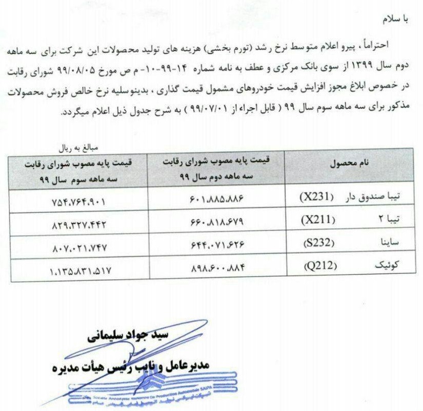 با صدور مجوز افزایش قیمت از سوی شورای رقابت، گروه خودروسازی سایپا قیمت جدید 4 محصول خود را ویژه سه ماهه سوم 99 اعلام کرد و این افزایش قیمت شامل تیبا صندوقدار، تیبا 2، ساینا و همچنین خودروی کوییک می شود که بین 15 تا 24 میلیون تومان نسبت به قبل افزایش قیمت را تجربه کرده اند، این درحالیست که قیمت های ذکر شده بدون احتساب بیمه، مالیات و هزینه های دیگر خواهد بود.