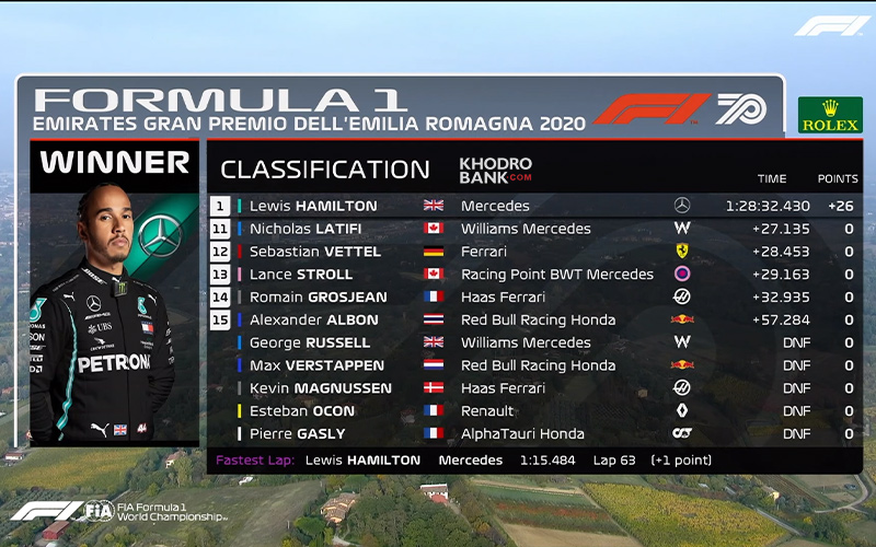 با برد لوئیس همیلتون و رده دوم والتری بوتاس مرسدس توانست اولین تیم تاریخ باشد که هفت بار متوالی به مقام قهرمانی تیمی فرمول یک دست پیدا میکند.
