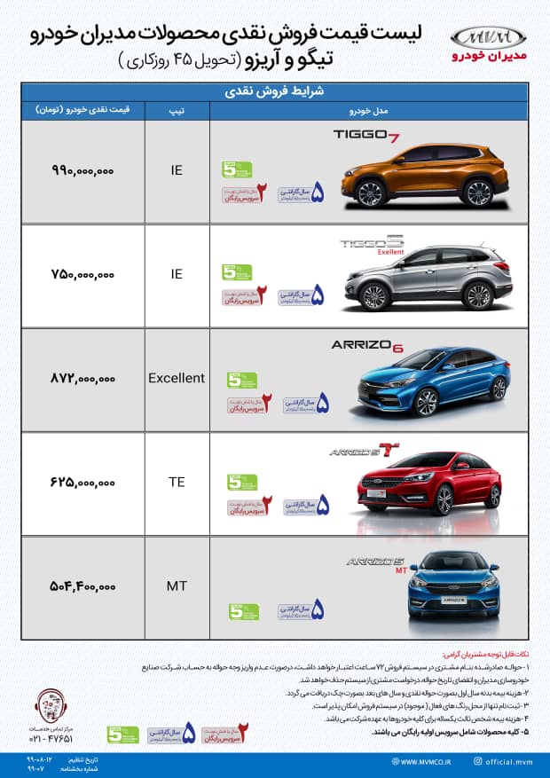 این روزها افزایش قیمت رسمی محصولات خودروسازان به تیتر اول رسانهها تبدیل شده است. پس از آنکه ایران خودرو و سایپا طی روزهای گذشته قیمت جدید محصولات خود را اعلام نمودند، شرکت مدیران خودرو نیز قیمت جدید خودروهای چری و ام وی ام خود را اعلام نمود. در لیست قیمتهای جدید مدیران خودرو، چری تیگو 7 به مرز یک میلیارد تومان نزدیک شده است و ام وی ام 315 نیز به عنوان ارزانترین محصول این خودروسازی 306 میلیون تومان قیمتگذاری شده است. در ادامه میتوانید قیمت جدید محصولات مدیران خودرو را مشاهده کنید: