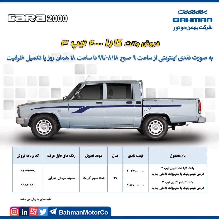 باتوجه به اعلام گروه بهمن، خودروی وانت کارا تک کابین 2000 مجهز به فرمان هیدرولیک و به همراه تجهیزات جدید داخلی، به قیمت مصوب 203 میلیون و 700 هزار تومانی ثبت سفارش خواهد شد، این درحالیست که خودروی مذکور در مهرماه با قیمت 197 میلیون و 700 هزار تومانی به مشتریان عرضه شده است.