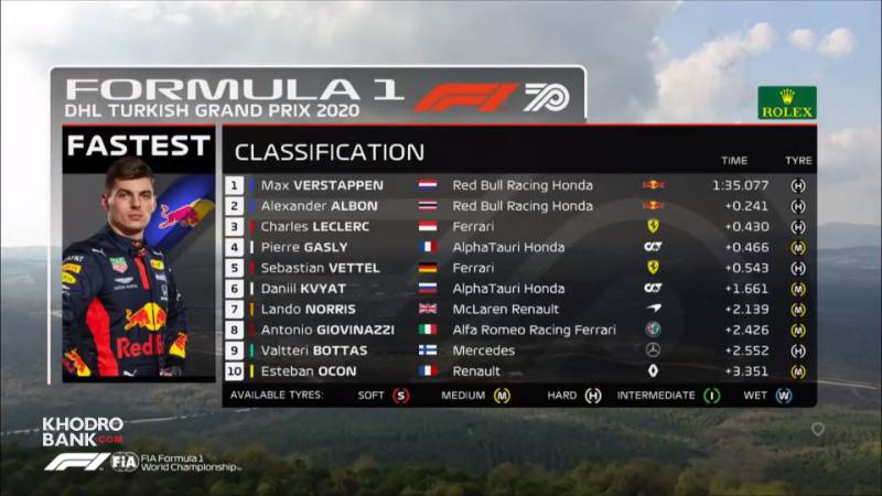 اما بوتاس اولین رانندهای بود که پس از کمی خشک شدن سطح پیست توانست صدر جدول تمرین را در اختیار بگیرد و تقریبا این برتری در حدود دو سوم از زمان این تمرین ادامه داشت اما با خشک شدن سطح مسیر، ابتدا این مکس ورشتپن بود که توانست زمان بهتری را ثبت کند. اما در همین حین به یکباره فراریها سریعتر شدند و در ابتدا این سباستین فتل بود که بعد از مدتها توانست خودی نشان دهد و در صدر زمان تمرین قرار گرفت البته این صدر نشینی خیلی به طول نینجامید و هم تیمیاش چارلز لکلرک توانست صدر را از او برباید.