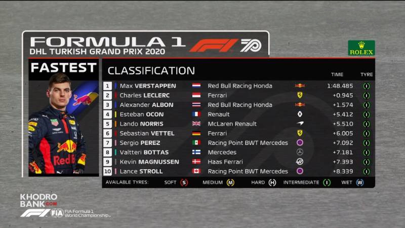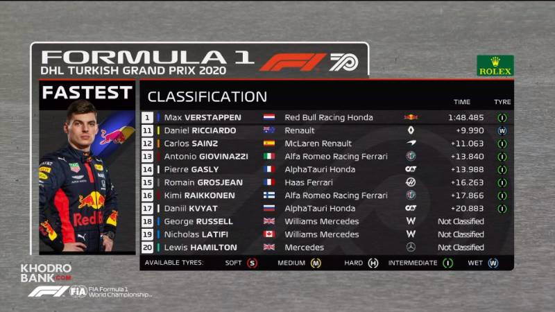 مکس ورشتپن در جلسه سوم تمرین گرندپری ترکیه 2020 فرمول یک سریعترین زمان را به نام خود ثبت کرد در حالی که لوئیس همیلتون هیچ زمانی را به خود اختصاص نداد.