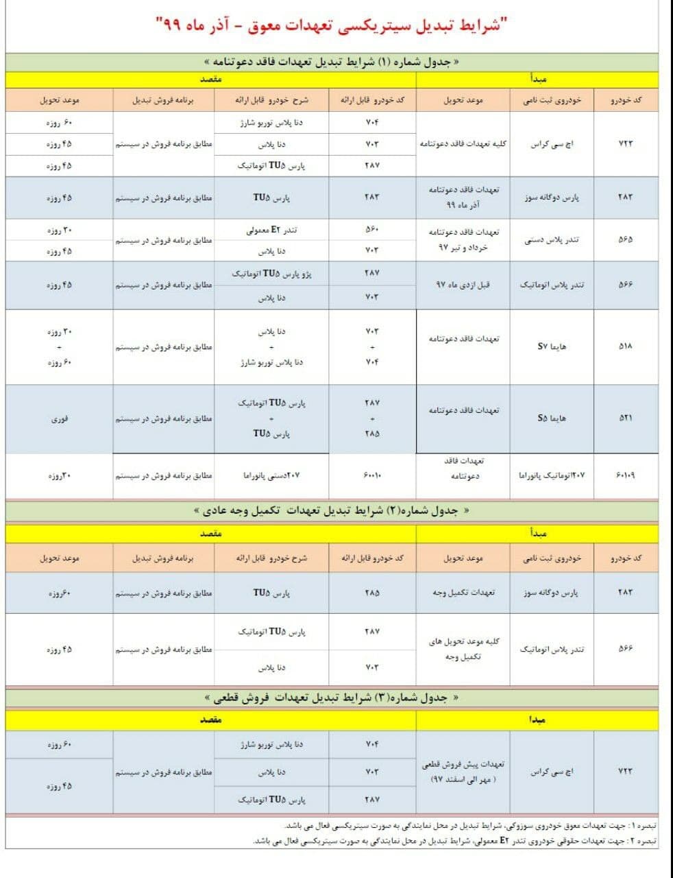 لازم به ذکر است که این طرح تبدیل از ساعت 10 صبح روز شنبه 1 آذرماه آغاز شده و مربوط به تعهدات معوق " كارتكس" و "بنام" (شخصيت حقيقی و حقوقی) مشتریان گروه صنعتی ایران خودرو می شود که جزییات آن در جدول زیر آمده است.