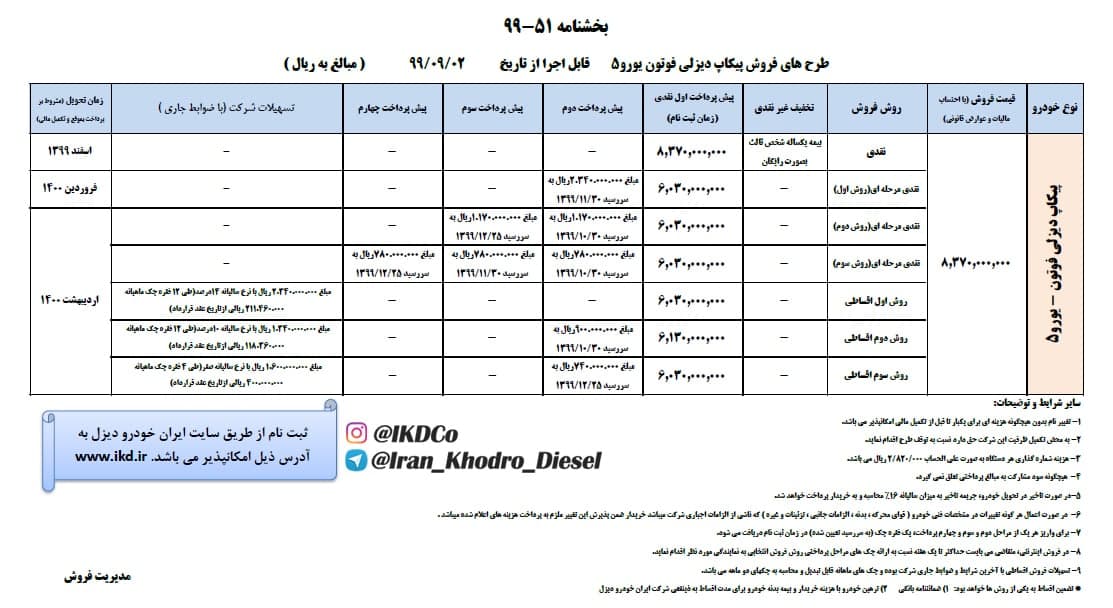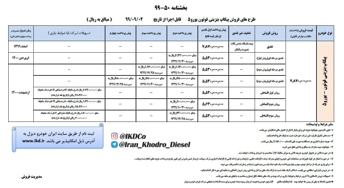 گروه صنعتی ایران خودرو در بخش نامه جدید فروش خود، شرایط فروش دو نسخه بنزینی و دیزلی پیکاپ "فوتون تونلند" را اعلام کرد و متقاضیان می توانند با انتخاب دو روش فروش نقد و اقساط، نسبت به ثبت نام این خودرو ویژه آذرماه 99 به تعداد و مدت زمان محدود اقدام کرده و خودروی ثبت نامی خود را در فروردین و یا اردیبهشت ماه سال 1400 تحویل بگیرند.