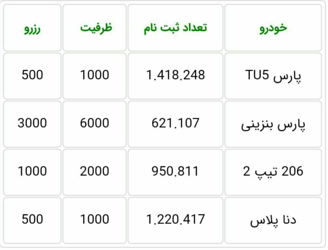 مطابق آمار منتشر شده از نتایج قرعه کشی فروش فوقالعاده ایران خودرو، ده هزار نفر در این شرایط به عنوان برندگان لیست اصلی و پنج هزار نفر به عنوان لیست ذخیره انتخاب شدند، حالآنکه تعداد کلی شرکت کنندگان در شرایط فروش فوق العاده ایران خودرو، بیش از چهار میلیون نفر بوده است. در جدول زیر میتوانید تعداد ظرفیت هر خودرو و تعداد متقاضیان هر دستگاه را مشاهده کنید: