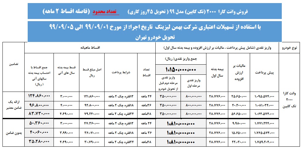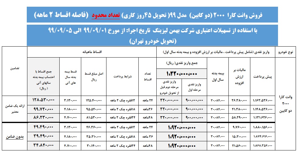 فروش اقساطی وانت کارا تک کابین و دوکابین توسط گروه بهمن ویژه آذرماه + جدول