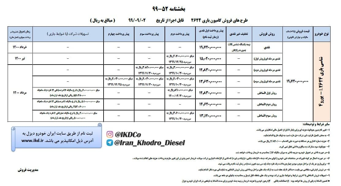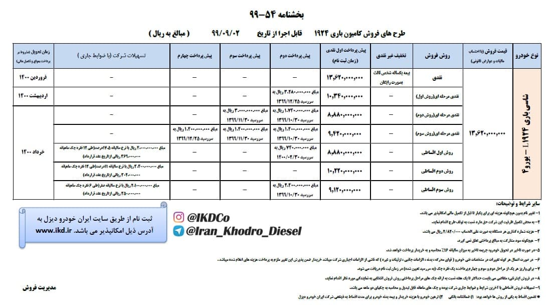 ایران خودرو دیزل پیرو بخشنامه فروش اخیر خود، کامیون های باری و کمپرسی 1924 و 2624 را به صورت نقد و اقساط و با قیمت قطعی به مشتریان واگذار می کند. گفتنی است که برای کامیون های 1924 موعد تحویل فروردین تا خردادماه سال 1400 تعیین شده و مشتریان کامیون های 2624 هم می توانند کامیون ثبت نامی خود را در بازه خرداد تا مردادماه سال 1400 دریافت کنند.