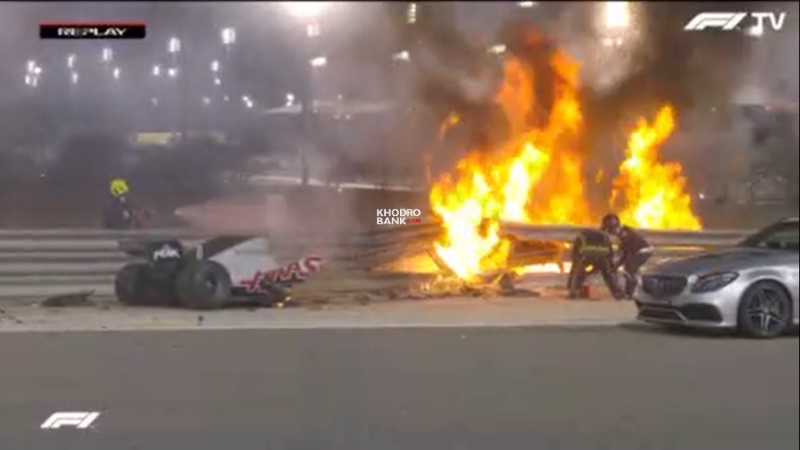 خودرو رومن گروژان پس از برخورد در گرندپری بحرین