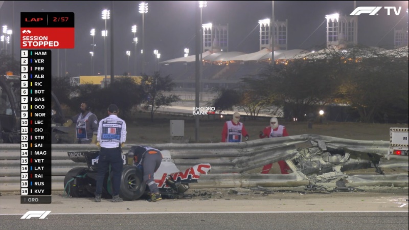 در نتیجه این برخورد مسابقه فرمول یک بحرین با برافراشته شدن پرچم قرمز متوقف شد تا خودرو رومن از محل حادثه منتقل شود و دیواره آسیب دیده ترمیم گردد. توقفی که بیشتر از ۴۵ دقیقه به طول انجامید. در ادامه توجه شما را به تصاویر این برخورد شدید جلب می کنم.