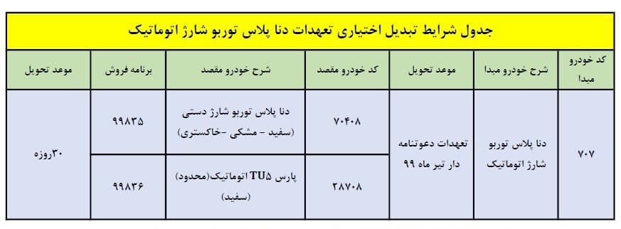 1- شرايط تبديل جدول زیر صرفا براي تعهدات دنا پلاس توربو اتوماتيک دعوتنامه دار است