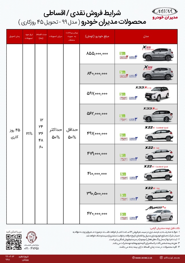 در این طرح فروش که 13 آذرماه از سوی مدیران خودرو اعلام و اجرا شده است، محصولات مختلفی همچون ام وی ام X55، ام وی ام X33S، ام وی ام X22 و همچنین خودروی ام وی ام 315S اتوماتیک در مدل های مختلف به مشتریان عرضه خواهد شد که جزییات بیشتر آن را می توانید در جدول زیر شاهد باشید.