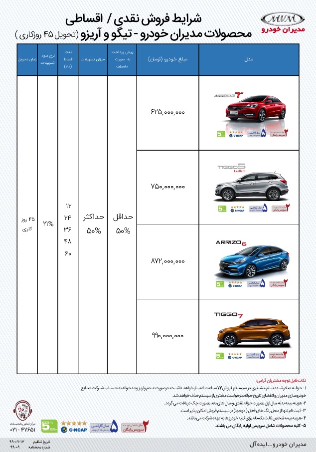 در شرایط فروش، شرکت مدیران خودرو محصولاتی همچون چری آریزو5 T را با قیمت 625 میلیون تومانی، چری تیگو 5 اکسلنت را با قیمت 750 میلیون تومانی، چری آریزو 6 را با قیمت 872 میلیون تومانی و همچنین خودروی چری تیگو 7 را به عنوان لوکس ترین محصول خود با قیمت 990 میلیون تومانی ثبت سفارش خواهد کرد که جزییات فروش آن را می توانید در جدول زیر شاهد باشید.