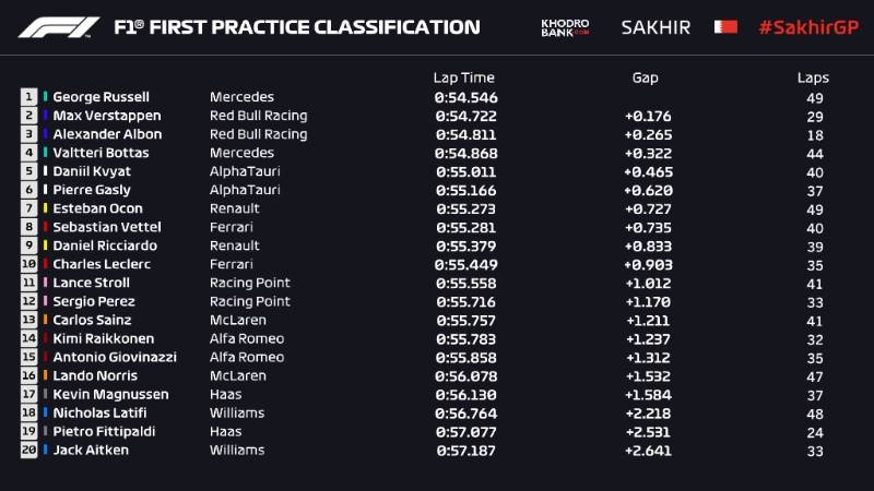 جورج راسل شگفتی تمرین اول گرندپری سخیر شد. او با خودروی همیلتون توانست قابلیتهای خودش را به رخ همه بکشاند. مکس ورشتپن کماکان در همان جایگاه سابق یعنی رده دوم ماند. رده سوم به آلکس آلبون رسید.