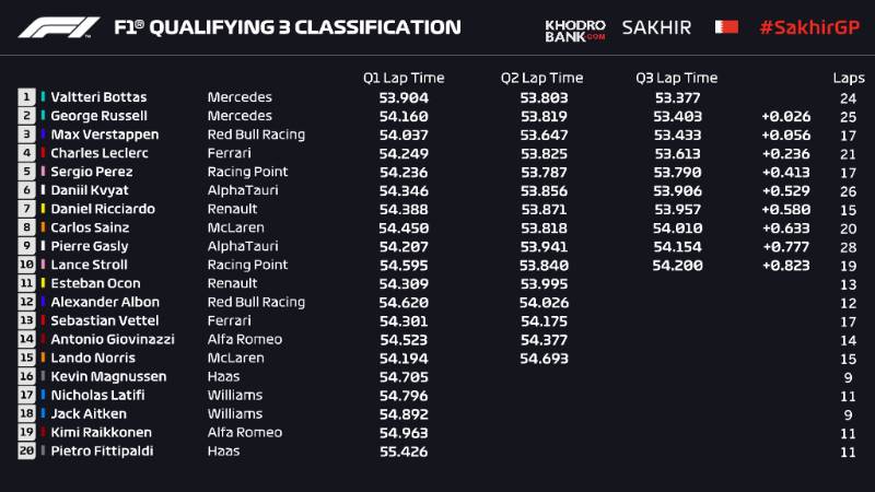 جورج راسل علی رغم اینکه در رده دوم خط استارت سخیر 2020 ایستاد اما نشان داد که تواناییهای غیر قابل انکاری دارد و هم تیمی او در غیاب قهرمان 7 دوره فرمول یک جهان، لوئیس همیلتون اینبار از رده یک استارت خواهد زد و مکس ورشتپن تمام تلاش خود را بکار بست که باز هم عضو گروه پیشتاز باقی بماند.
