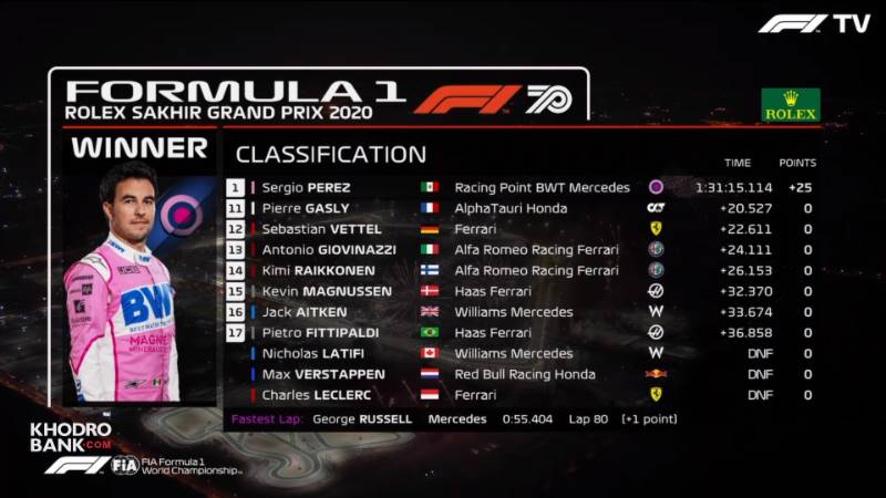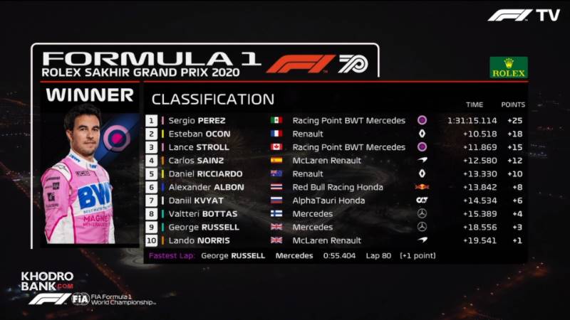 سکوی گرندپری سخیر 2020اما دور آخر پر از شگفتی بود. سرجیو پرز برای اولین بار در دوران حرفهای حضورش در فرمول یک موفق به فتح رده اول یک گرندپری شد و استبان اوکون و لنس استرول نیز با خوش شانسی توانستند ردههای دوم و سوم را کسب کنند. این اولین سکوی دو ماشینه ریسینگ پوینت بود و طبعا در انتها این سوال مطرح خواهد شد، آیا از دست دادن سرجیو پرز تصمیم درستی بود؟ در توانایی و شایستگی سباستین فتل اصلا شکی وجود ندارد. او قهرمان 4 دوره فرمول یک جهان است اما لنس چطور؟