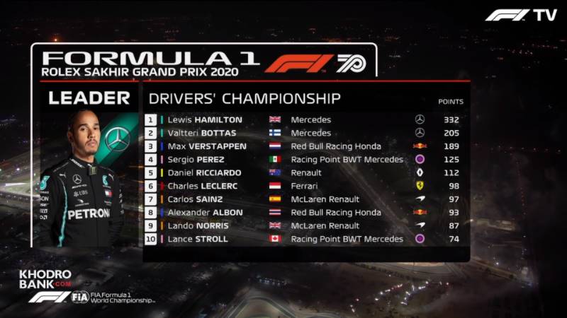 جدول رده بندی رانندگان پس از گرندپری سخیر 2020 بصورت زیر است: