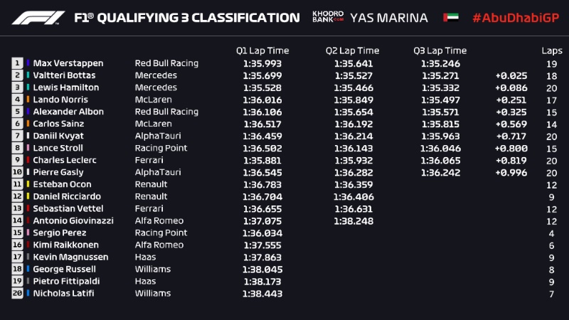 لوئیس همیلتون با شگردی متفاوت به پیست برگشت و از پیچهای 11 و 12 و 13 شروع به گرم کردن لاستیکها و ترمزهایش کرد، با یک سرعت مناسب دور نهایی را آغاز کرد سکتور اول و دوم بسیار سریع بود و هر دو بنفش شد و در سکتور سوم تنها جایی بود که کمی اشتباه داشت و از پیست کمی بیرون رفت. در نهایت زمان 1:35:332 کسب کرد که بوتاس ثانیهای بعد با یک سکتور سوم عالی زمان 1:35:271 را بدست آورد اما مکس ورشتپن که بر خلاف راوند اول که بسیار بد بود، سنت شکنی کرد و زمان بی نظیر 1:35:246 را به نام خود نوشت و تنها با 0.025 ثانیه اختلاف نسبت به بوتاس رده اول خط استارت مسابقه آخر این فصل را کسب کرد. ردهبندی سایر رانندگان در خط شروع گرندپری ابوظبی 2020 به شرح زیر است: