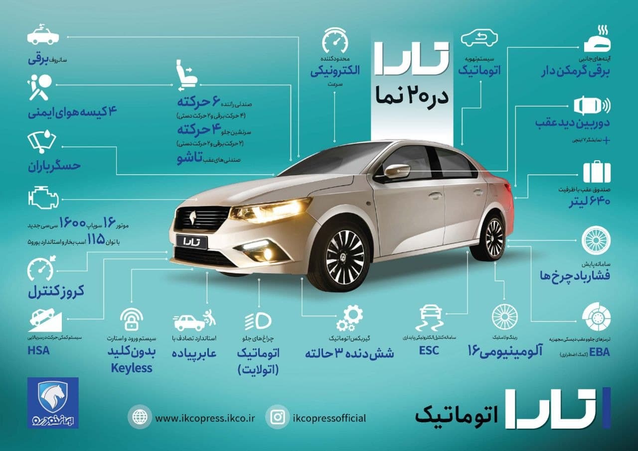 تارا، نام نهایی پروژه K132 گروه صنعتی ایران خودرو است که با ویژگی های بسیار بیشتری نسبت به دیگر محصولات تولید داخل به بازار عرضه شده و استانداردهای جدیدی را در بین خودروهای تولید داخل تعریف خواهد کرد. این خودرو برخی تکنولوژی های روز صنعت خودروسازی را در خود جای داده است که در این خصوص می توان به موارد زیر اشاره کرد.