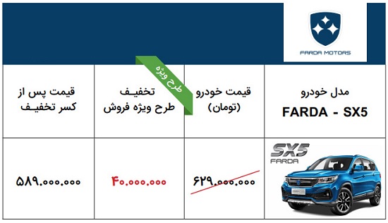 باتوجه به شرایط فروش اعلام شده از سوی شرکت خودروسازی فردا، کراس اوور جدید فردا SX5 قیمت 629 میلیون تومانی دارد که با تخفیف ویژه 40 میلیون تومانی، با قیمت نهایی 589 میلیون تومانی و با موعد تحویل 60 روزه و در مدل 1400 به مشتریان عرضه خواهد شد.