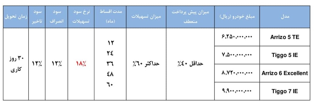 در شرایط فروش محصولاتی همچون چری آریزو5 T با قیمت 625 میلیون تومانی، چری تیگو 5 اکسلنت با قیمت 750 میلیون تومانی، چری آریزو 6 با قیمت 872 میلیون تومانی و خودروی چری تیگو 7 با قیمت 990 میلیون تومان ثبت سفارش می شود و موعد تحویل پس از ثبت نام حداکثر 30 روز کاری خواهد بود که جزییات فروش را می توانید در جدول زیر شاهد باشید.