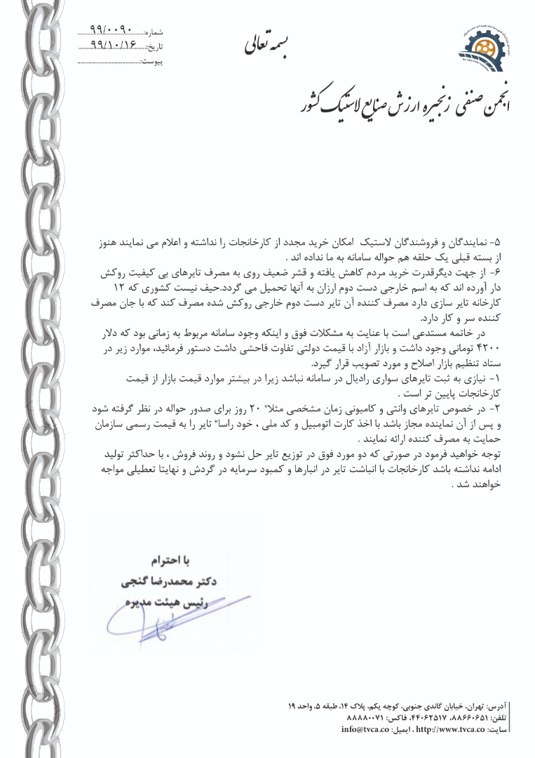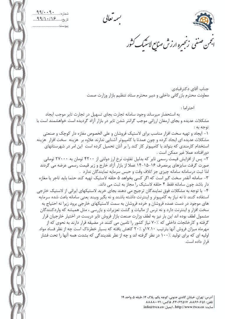 در تاریخ 16 دیماه سال 99، دکتر محمدرضا گنجی، رئیس هیئت مدیره انجمن صنفى صنايع لاستيك كشور طی نامه ای خطاب به دکتر قبادی، دبیر ستاد تنظیم بازار وزارت صمت، به مشکلات سانامه تجارت برای این صنف اشاره کرد و مواردی همچون افزایش شدید نرخ ارز دولتی، تمایل نمایندگان فروش به استفاده از لاستیک های خارجی به دلیل مدیریت ناصحیح، و یا کاهش قدرت خرید مصرف کننده در این نامه بیان شده و راه حل هایی برای این مشکلات نیز گفته شده است.