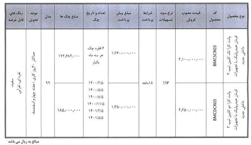در این شرایط فروش خودروی کارا تک کابین تیپ 3 با فرمان هیدرولیک و تجهیزات داخلی جدید با قیمت مصوب فروش 210 میلیون تومانی به مشتریان عرضه می شود و همچنین نسخه دو کابین این خودرو با قیمت 225 میلیون تومانی ثبت سفارش خواهد شد که برای هر دو مدل، مشتریان امکان خرید اقساطی با مدت زمان بازپرداخت 18 ماهه را خواهند داشت که می توانید جزییات بیشتر آن را در جدول زیر شاهد باشید.