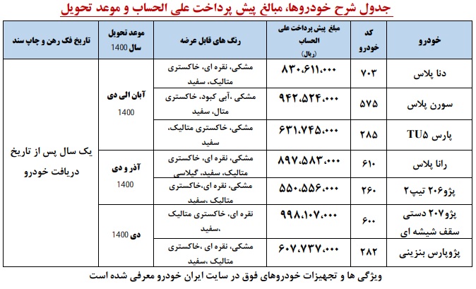 در این طرح خودروهای دنا پلاس، سورن پلاس، پارس با موتور 5TU، رانا پلاس، پژو ۲۰۶ تیپ دو، پژو ۲۰۷ با سقف شیشهای و پژو پارس بنزینی عرضه شده است. موعد تحویل خودروها آبان تا دی ماه سال آینده تعیین شده است.