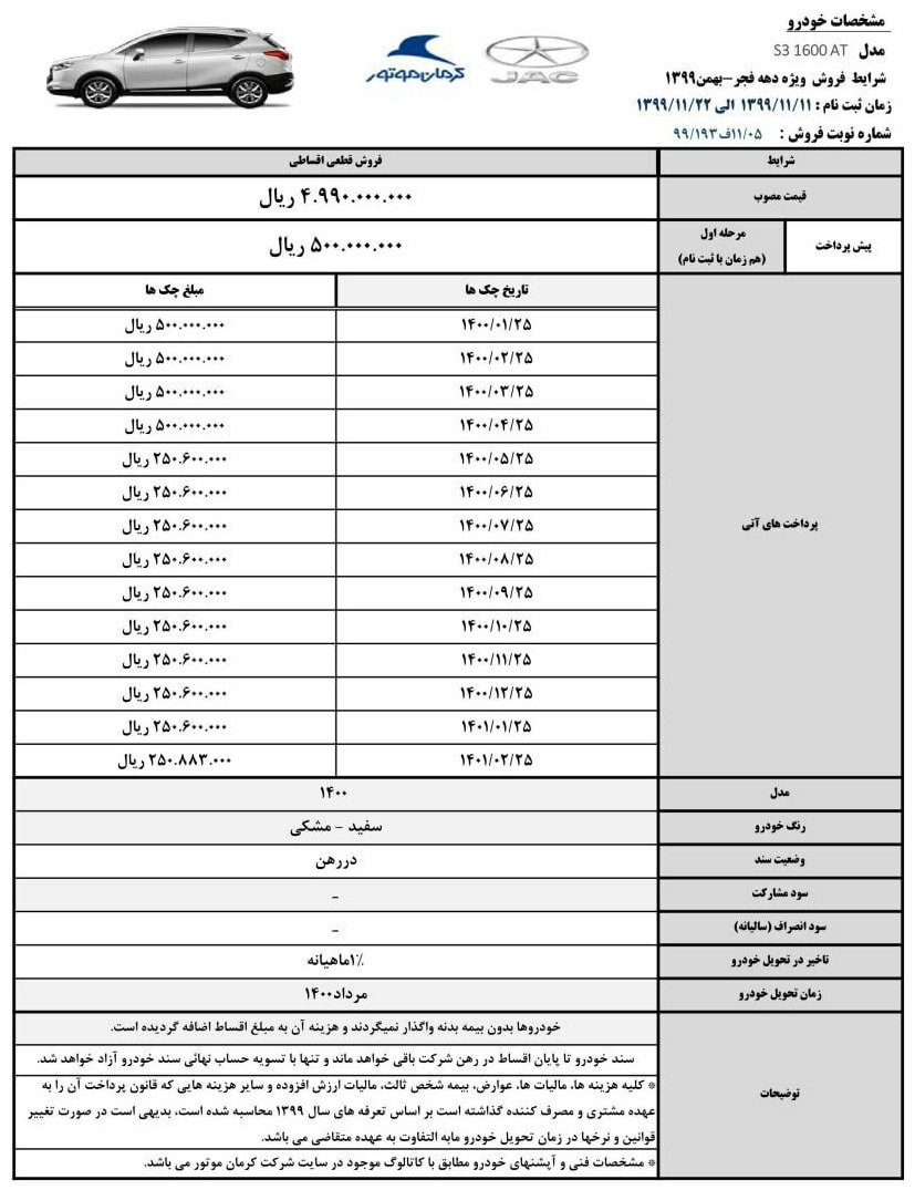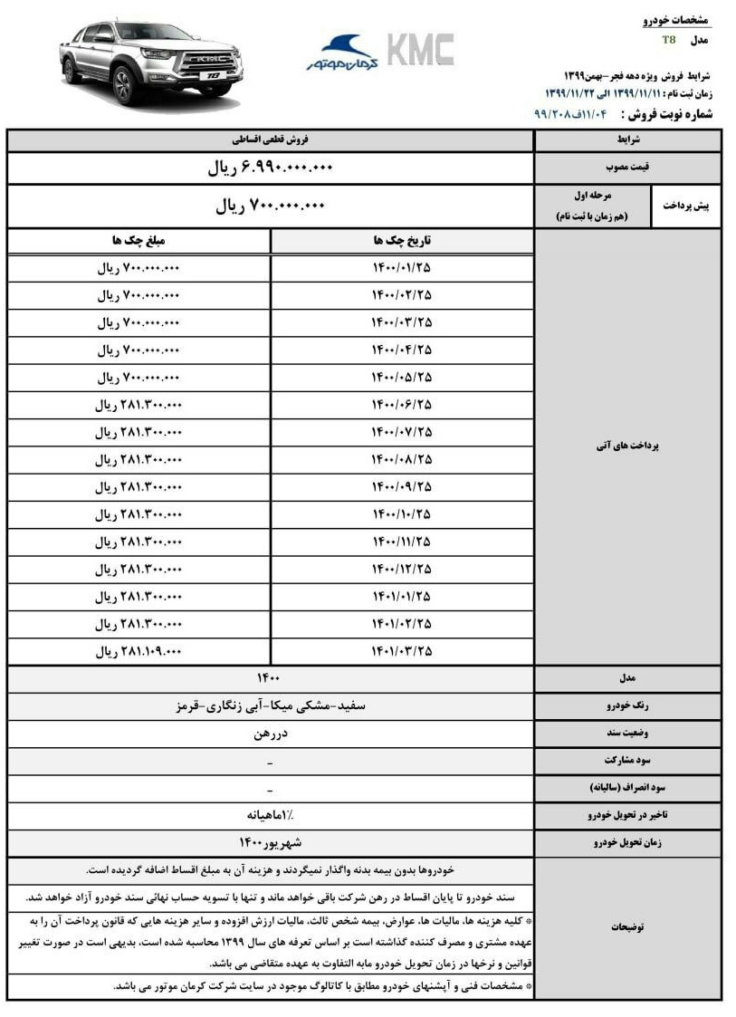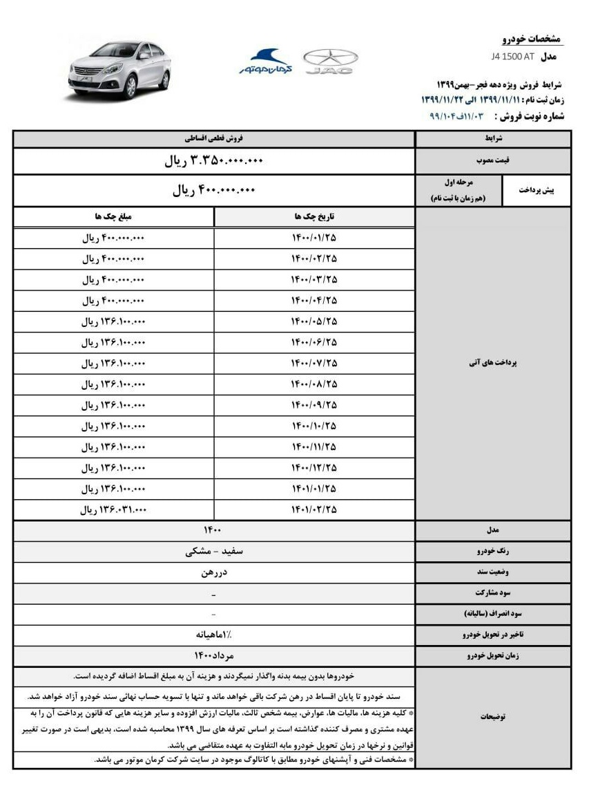 در این طرح فروش سه خودروی جک J4، جک S3 و همچنین خودروی جدید کرمان موتور یعنی پیکاپ KMC T8 با قیمت قطعی و اقساط 14 تا 15 ماهه به مشتریان عرضه می شود، با این حال موعد تحویل خودروی جک J4 و جک S3 برای مردادماه سال 1400 تعیین شده و خودروی جدید KMC T8 شهریورماه 1400 به مشتریان تحویل داده می شود که جزییات فروش و مبالغ تعیین شده را می توانید در جدول زیر ببینید.