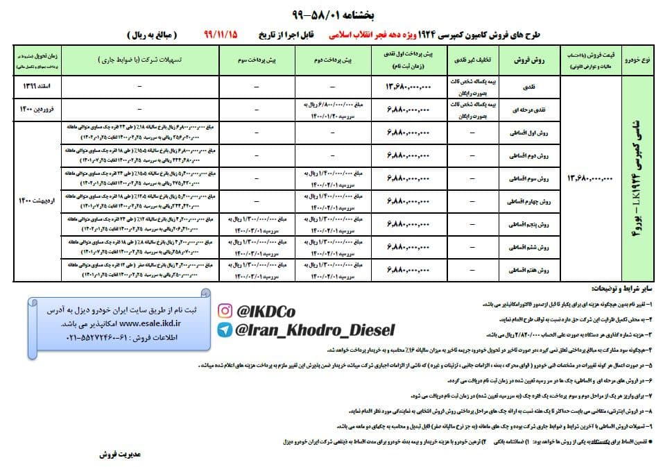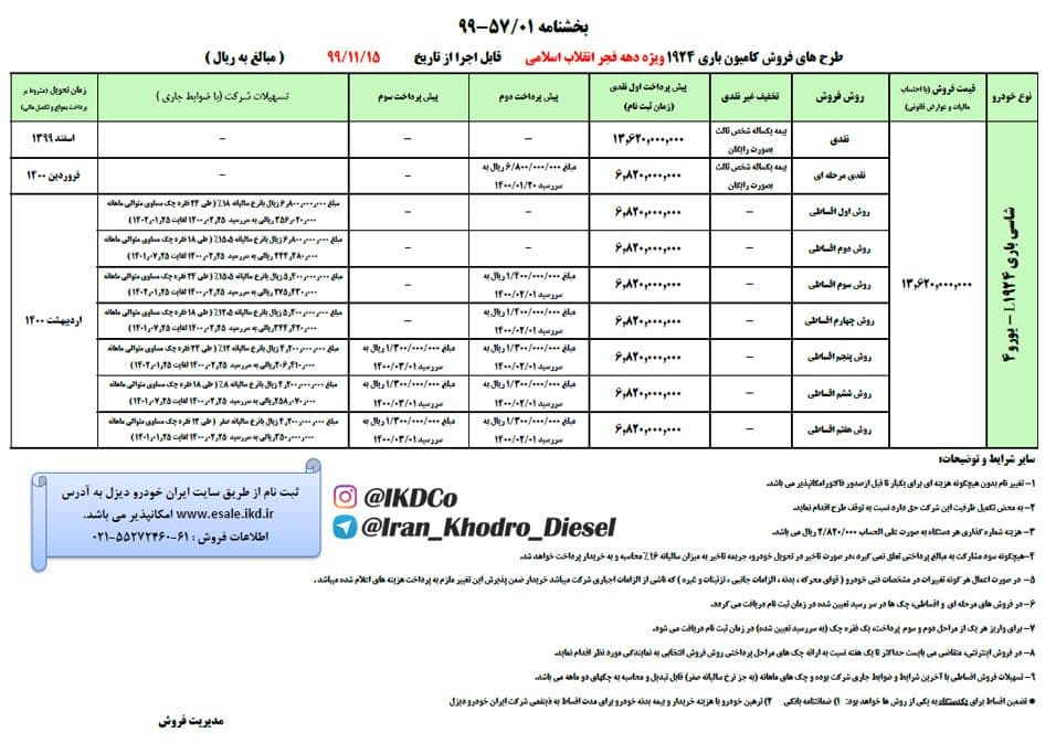 ایران خودرو دیزل در اطلاع رسانی جدید خود، شرایط فروش ویژه ای که پیش از این به مناسبت دهه فجر آغاز کرده بود را همچنان ادامه داده و متقاضیان می توانند به تعداد و مدت زمان محدود، دو نسخه باری و کمپرسی کامیون های 1924 ایران خودرو دیزل را به صورت نقدی، نقدی مرحله ای و یا اقساطی تا سقف تسهیلات 680 میلیون تومانی و بدون ضامن خریداری کنند.