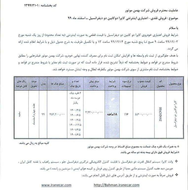 شرکت بهمن موتور در مرحله جدید فروش محصولات خود ویژه اسفندماه، شرایط فروش اقساطی خودروی کاپرا دوکابین دو دیفرانسیل را از ساعت 9 صبح روز یکشنبه 3 اسفندماه آغاز کرده و مشتریان می توانند تا روز پنجشنبه 14 اسفندماه 99، نسبت به ثبت نام این خودرو اقدام کنند و در هفته چهارم اسفندماه خودروی ثبت نامی خود را تحویل بگیرند.