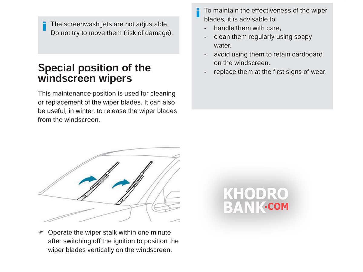 تارا اهرمهای برفپاککن به دلایل مختلفی از روی شیشه جلو بلند میشوند. در بعضی از مواقع مالک خودرو برای تعویض تیغههای برفپاککن آنها را از روی شیشه جلو بلند میکند و در مواقعی دیگر برای تمیز کردن خود شیشه جلو. در مدلهای جدید پژو همچون 208 و 301 چنانچه بخواهید همانند سایر خودروها اهرمهای برفپاککن را از روی شیشه جلو بلند کنید این اهرمها بهطور کامل بلند نمیشوند. بنابراین پژو در مدلهای جدیدش برای این موضوع تدبیر خاصی اندیشیده. کافی است حداکثر یک دقیقه پسازاینکه موتور خودرو خاموش شده برفپاککن را فعال کرد، در این حالت اهرمهای برفپاککن درست در حالتی که در نقطه مرگ بالایی قرار دارند متوقف میشوند. در این وضعیت دیگر حین بلند کردن اهرمهای برفپاککن از روی شیشه جلو، اهرمهای برفپاککن به لبه درب موتور برخورد نمیکنند.