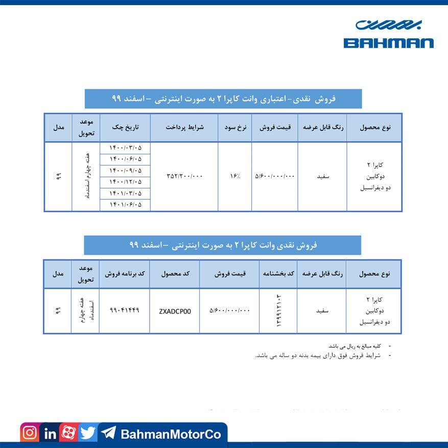 بهمن موتور ویژه اسفندماه امسال، شرایط فروش اقساطی خودروی کاپرا دوکابین دو دیفرانسیل را از ساعت 9 صبح روز یکشنبه 3 اسفندماه آغاز کرده و مشتریان تا روز پنجشنبه 14 اسفندماه 99 می توانند با شرکت در این طرح فروش نسبت به ثبت نام این خودرو اقدام کنند و در هفته چهارم اسفندماه خودروی ثبت نامی خود را تحویل بگیرند.