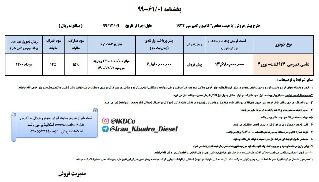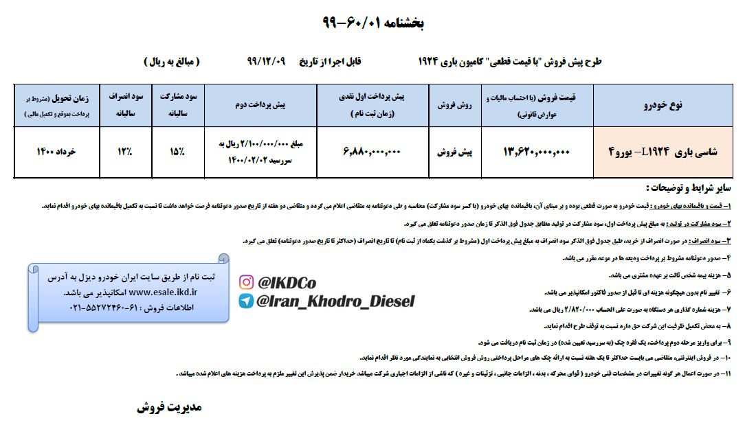 ایران خودرو دیزل در فروش اسفندماه 99، شرایط پیش فروش مدل های باری و کمپرسی کامیون های 1924 را آغاز کرده و مشتریان می تواند با قیمت قطعی هنگام تحویل، نسبت به ثبت نام این کامیون در دو مدل اقدام کنند.