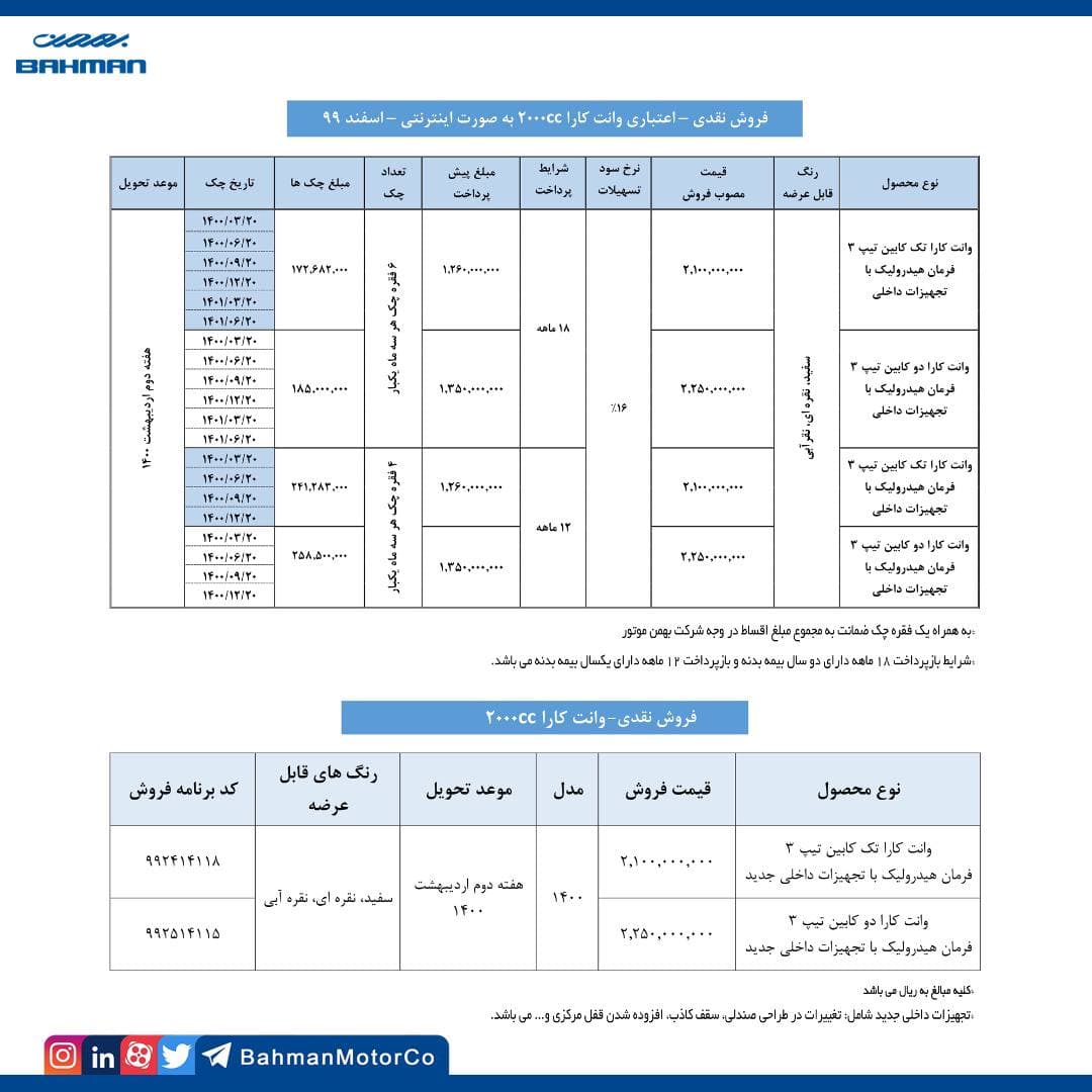 شرکت بهمن موتور در شرایط فروش ویژه اسفند ماه خود، شرایط فروش نقد و اعتباری وانت کارا تک کابین و دوکابین را از ساعت 9 صبح روز دوشنبه 18 اسفند ماه آغاز کرده و مشتریان تا روز دوشنبه 25 اسفندماه و یا تا زمان تکمیل ظرفیت فرصت دارند نسبت به خرید این خودرو در شرایط فروش متنوع بهمن موتور اقدام کنند.