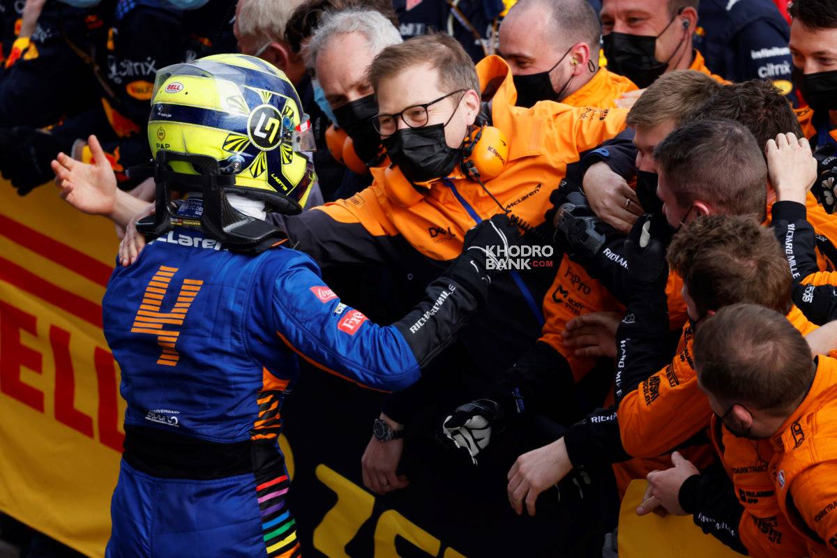 جشن شادی لندو نوریس و تیم مکلارن پس از کسب رده سوم گرندپری ایتالیا 2021
